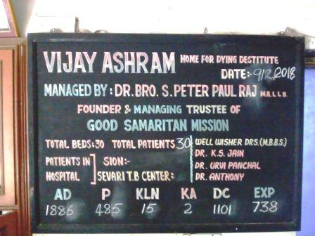 Large number of destitute men once without hope have found succor in Brother Peter Paul Raj at VIJAY ASHRAM a home for dying destitute at Vikhroli. 1886 dying destitute have been admitted to Vijay Ashram up to now, out of which 1101 were rehabilitated. 485 of these were brought and admitted to the Ashram by the Mumbai and Thane Police.